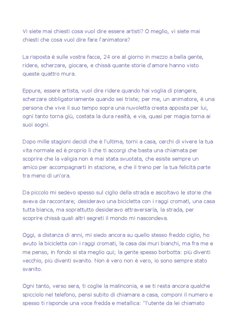 Lettera di un animatore. Lettera agli Animatori… - Parrocchia di Albosaggia Pagina iniziale » Articoli » Lettera agli Animatori ... accanto al "risultato finale" rappresentato dal lavoro con i nostri bambini, vi è un grande impegno personale di ciascun animatore che si impegna, attraverso la riflessione, ad interiorizzare il percorso di ciascun anno per condividerlo poi, attraverso i giochi di gruppo, le gite e ... Animatore / Accoglienza Esempi di Lettere di Presentazione Tutti animatore gli esempi di lettere di presentazione Esempio di lettera di presentazione per babysitter Lascia che il CV faccia il suo lavoro. Unisciti a più di 1,300,000 persone che cercano lavoro in tutto il mondo e fatti assumere più velocemente con il tuo miglior CV. Registrati Esempio Lettera di Presentazione Insegnante | LiveCareer Lettera di presentazione come Insegnante Claudio Rossi Via Vittoria, 14 - 20100 Milano Cell: +39 333/*1245789 E-mail: C.Rossi@email.com. Alla cortese attenzione del Dirigente scolastico. Sono attualmente alla ricerca di un posto di lavoro di docenza e fortemente interessato/a a fare domanda per insegnare presso il vostro Distretto scolastico. Cosa fa un animatore? | professione-lavoro.it Un animatore crea una vasta serie di immagini che formano l'animazione vista in film, pubblicità, programmi televisivi e videogiochi . In genere sono specializzati in uno di questi media e possono concentrarsi ulteriormente su un'area specifica, come i personaggi, lo scenario o lo sfondo. Gli animatori in genere utilizzano software per ...