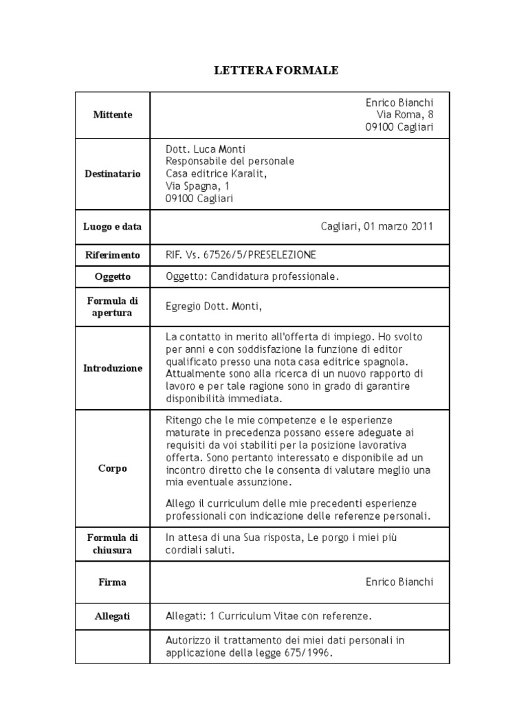Come Concludere una Lettera Se, per esempio, nel saluto iniziale si sono utilizzate le formule Egregio Sig. o Spett.le Sig., è appropriato utilizzare forme di conclusione quali ... Come impostare una lettera formale: guida dalla A alla Z Come nella lettera formale, rivolgiti al destinatario con la formula titolo + nome e cognome e dando sempre del Lei o del Voi se si tratta di un'azienda; ...