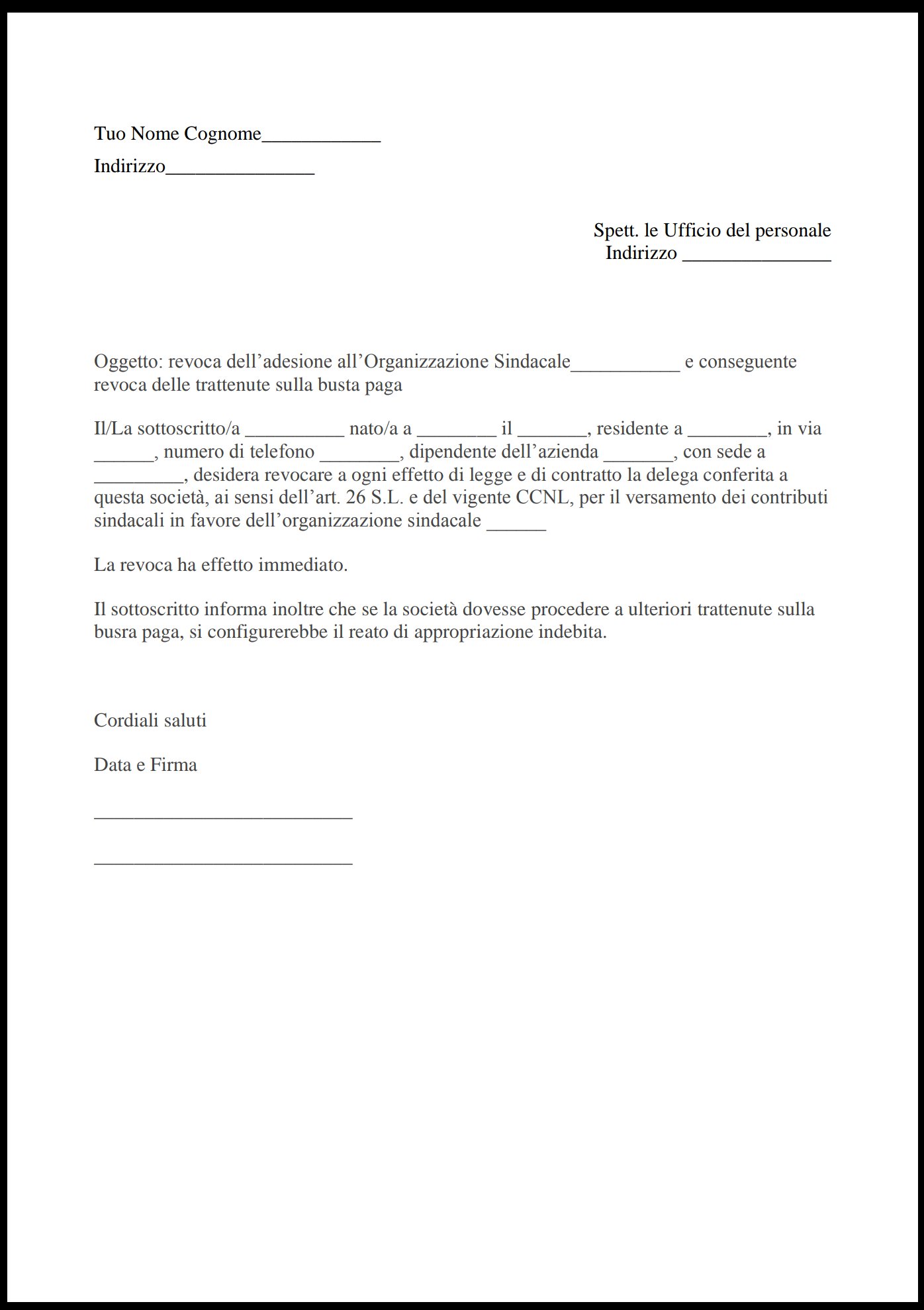 Lettera disdetta tessera sindacale uil